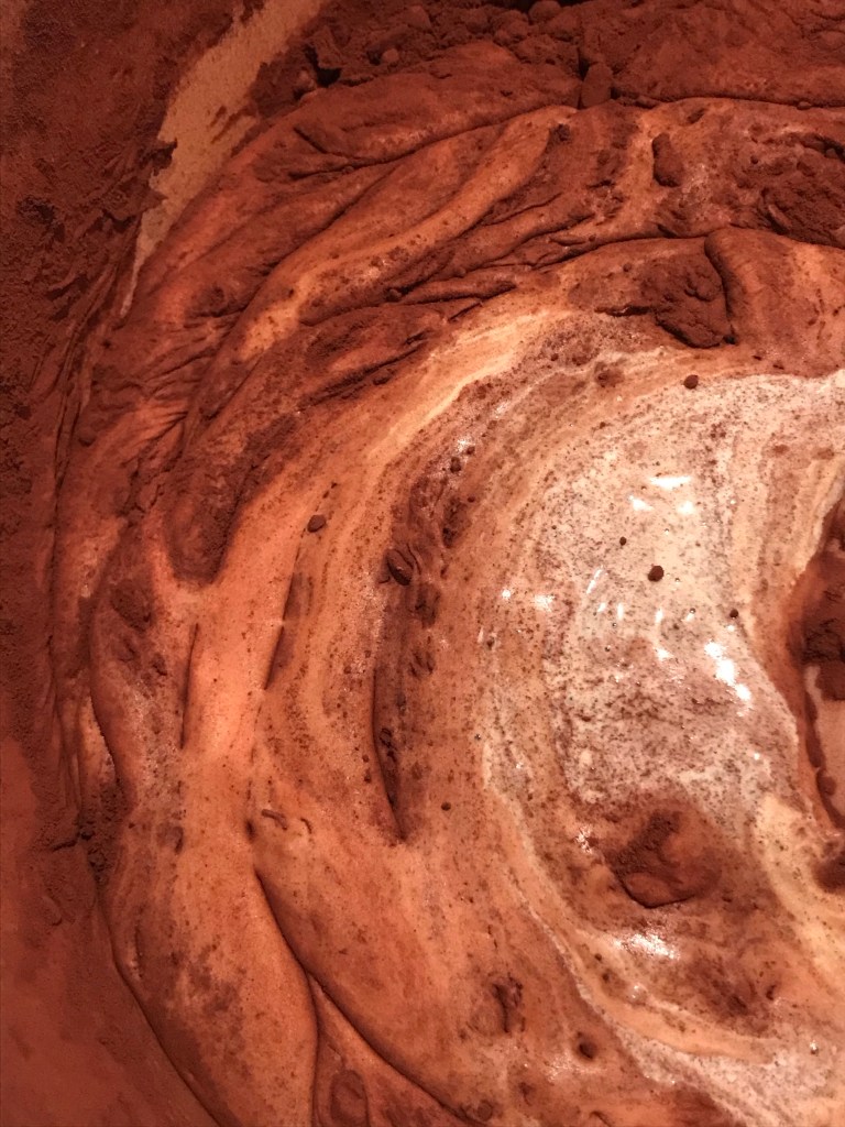 Schenk al roerend met een houten lepel de gesmolten boter bij het cacaomengsel.