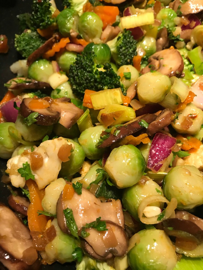 Als laatste de spruitjes toevoegen en roerbak deze nog een minuutje mee.