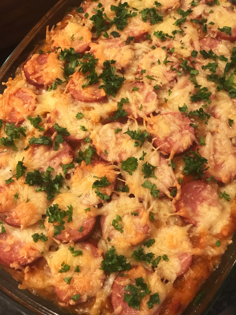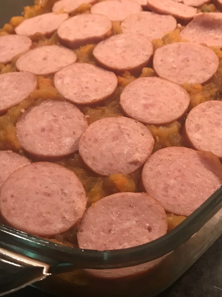 Nu de 2e laag stamppot , rookworst , geraspte kaas.