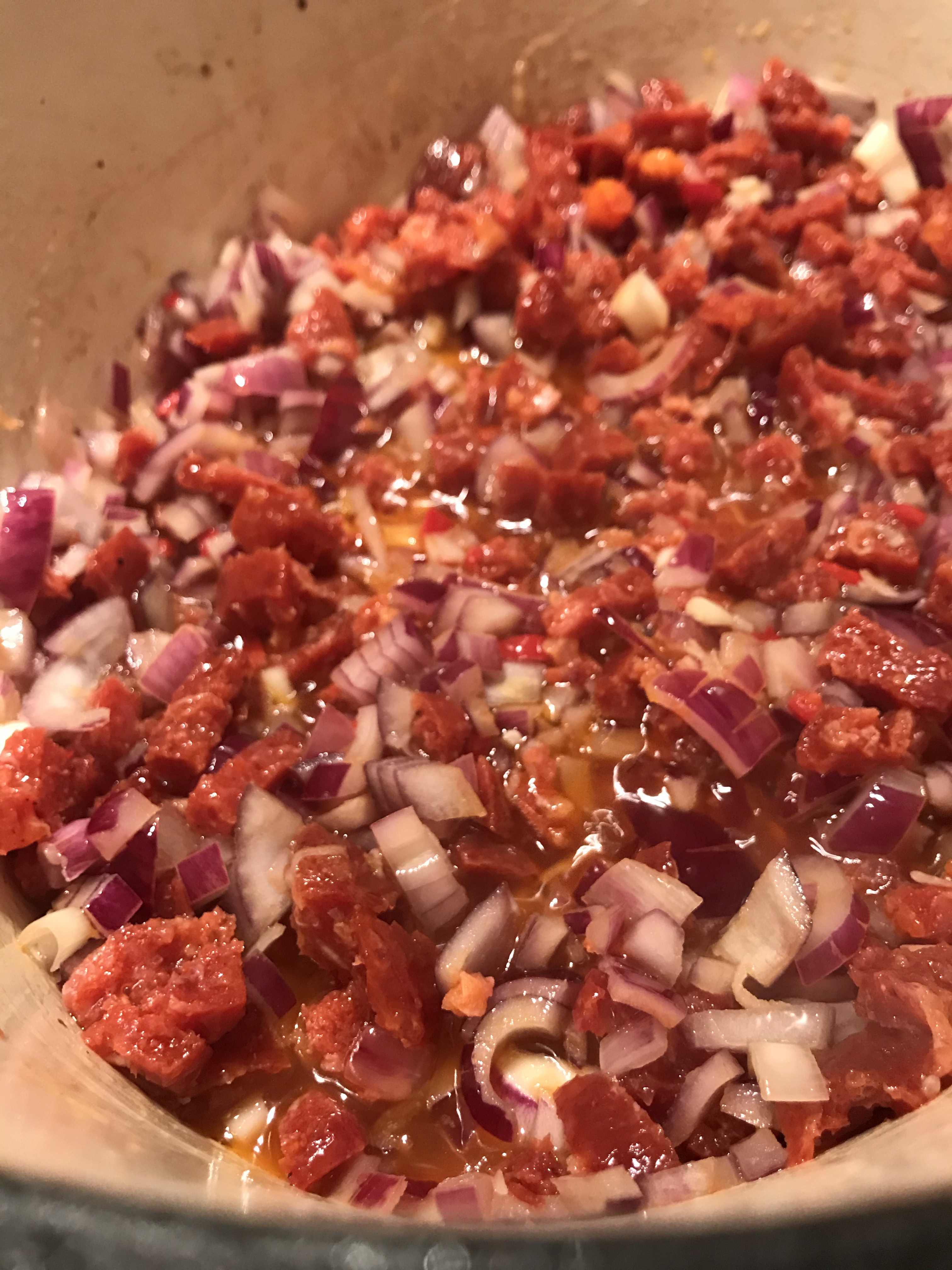 Pel de uien, snijd ze grof , samen met paprika’s en de rode peper en doe ze in de beker de blender.