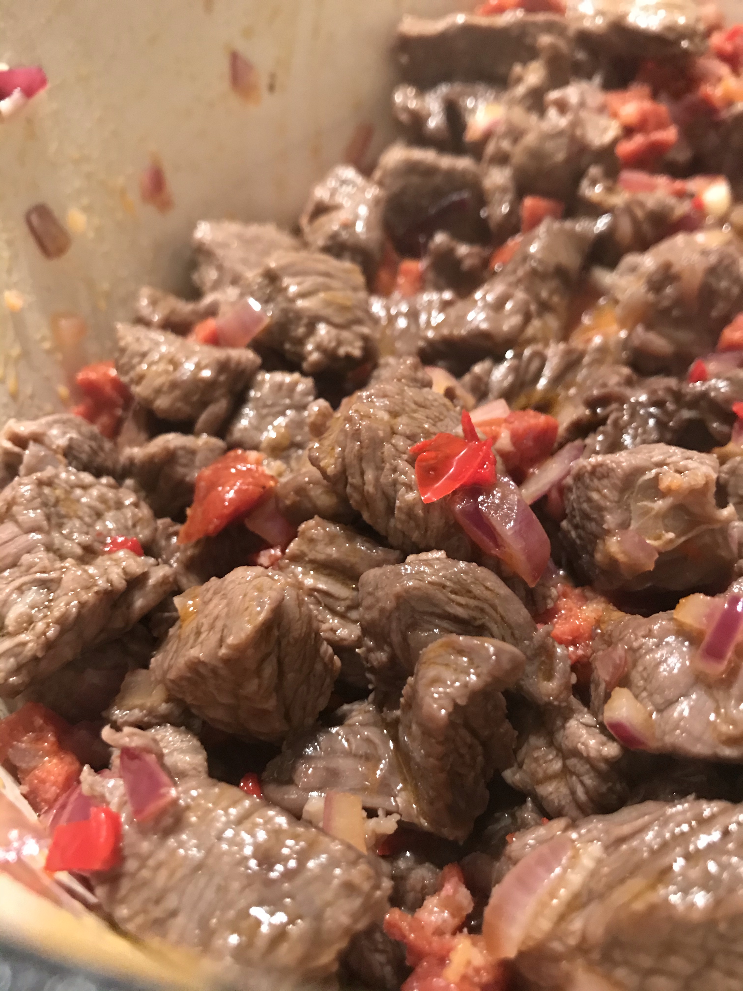 Doe ook het gemarineerde vlees in de pan.