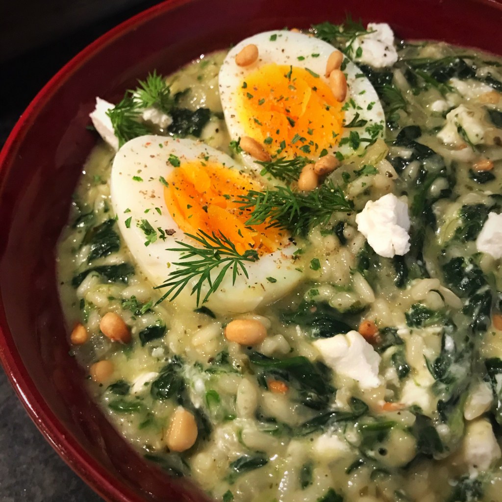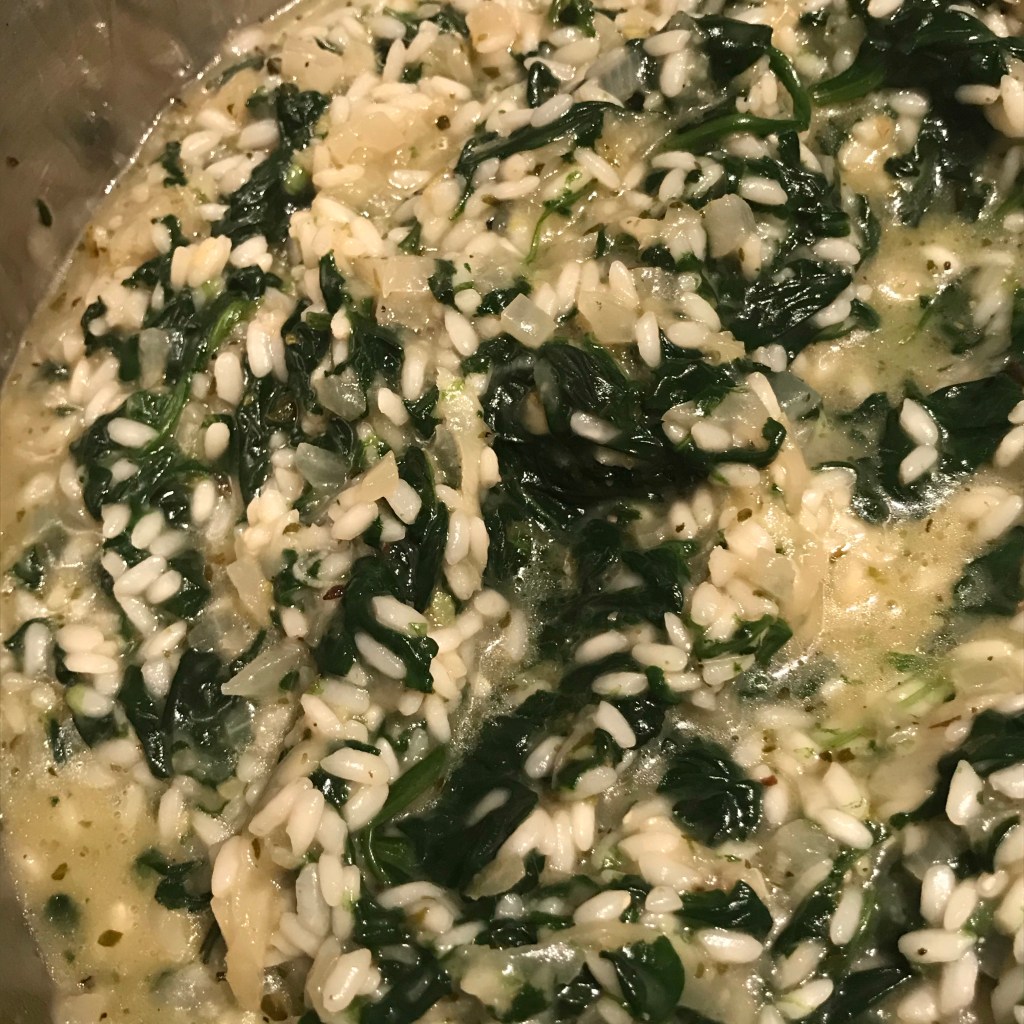 Schep na 15 min. in delen de spinazie door de risotto en laat de blaadjes net slinken.