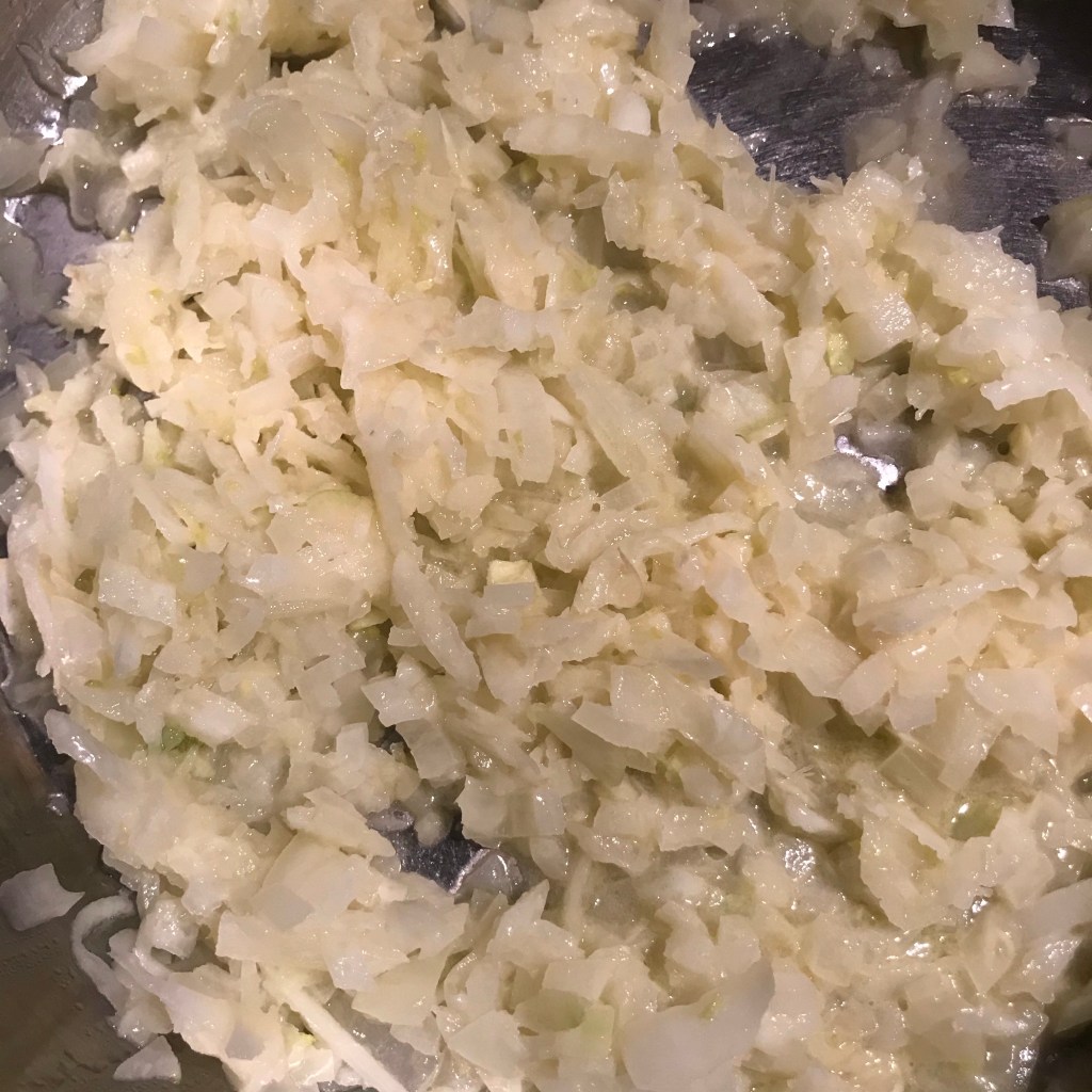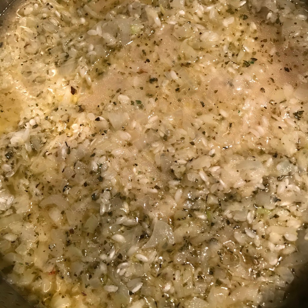 Roer de risotto rijst erdoor en bak al omscheppend tot de korrels glanzen.