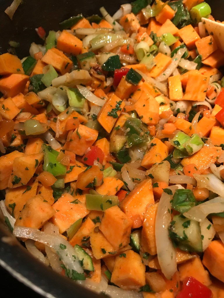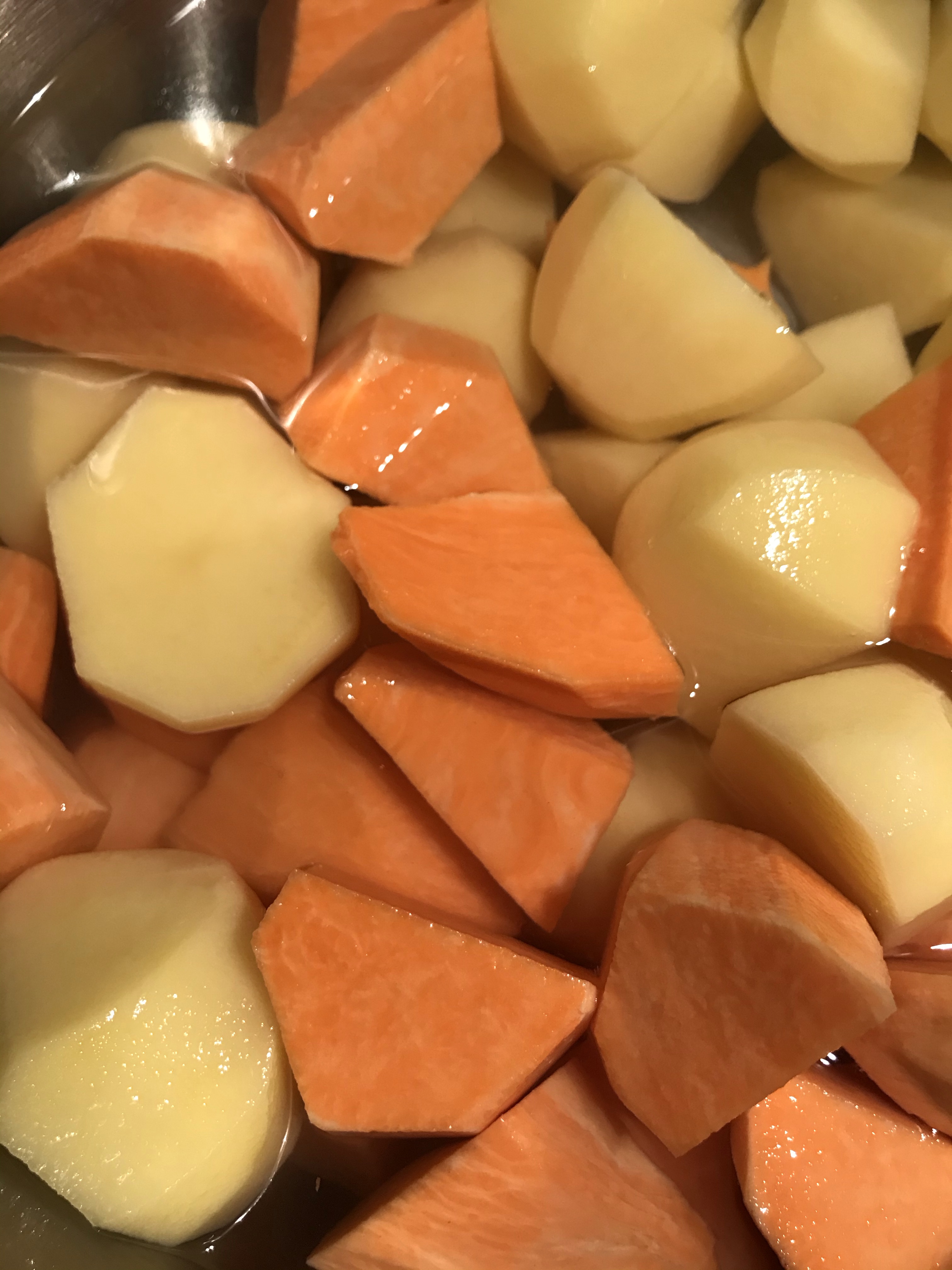 Schil de zoete aardappels en snijd ze in kleine blokjes.