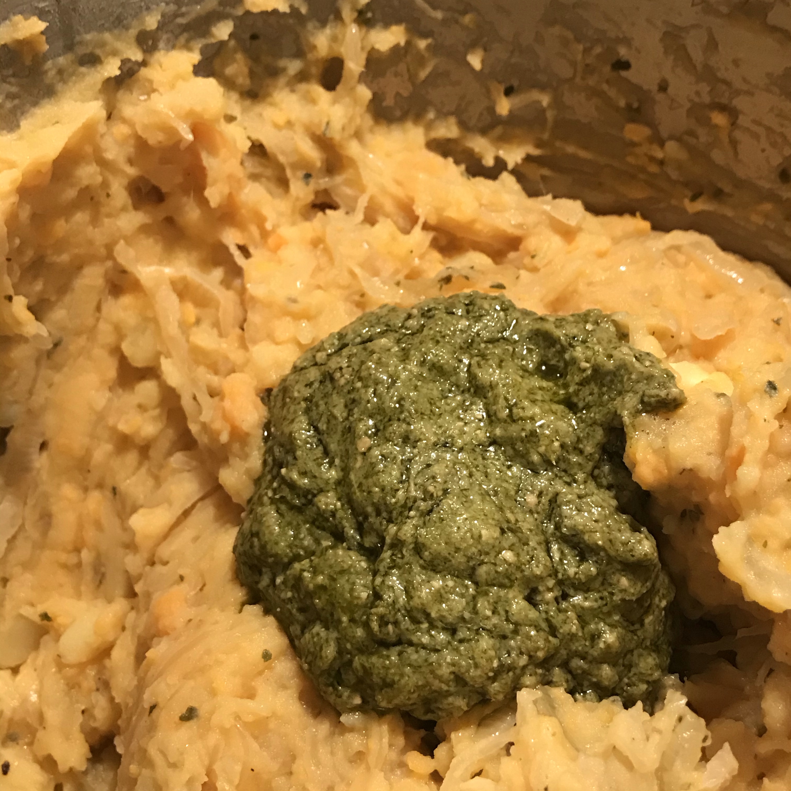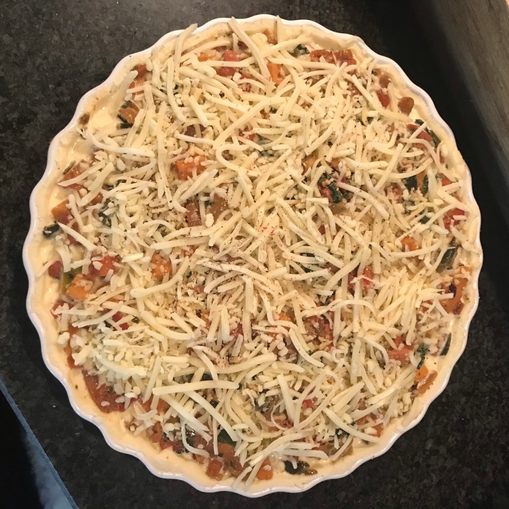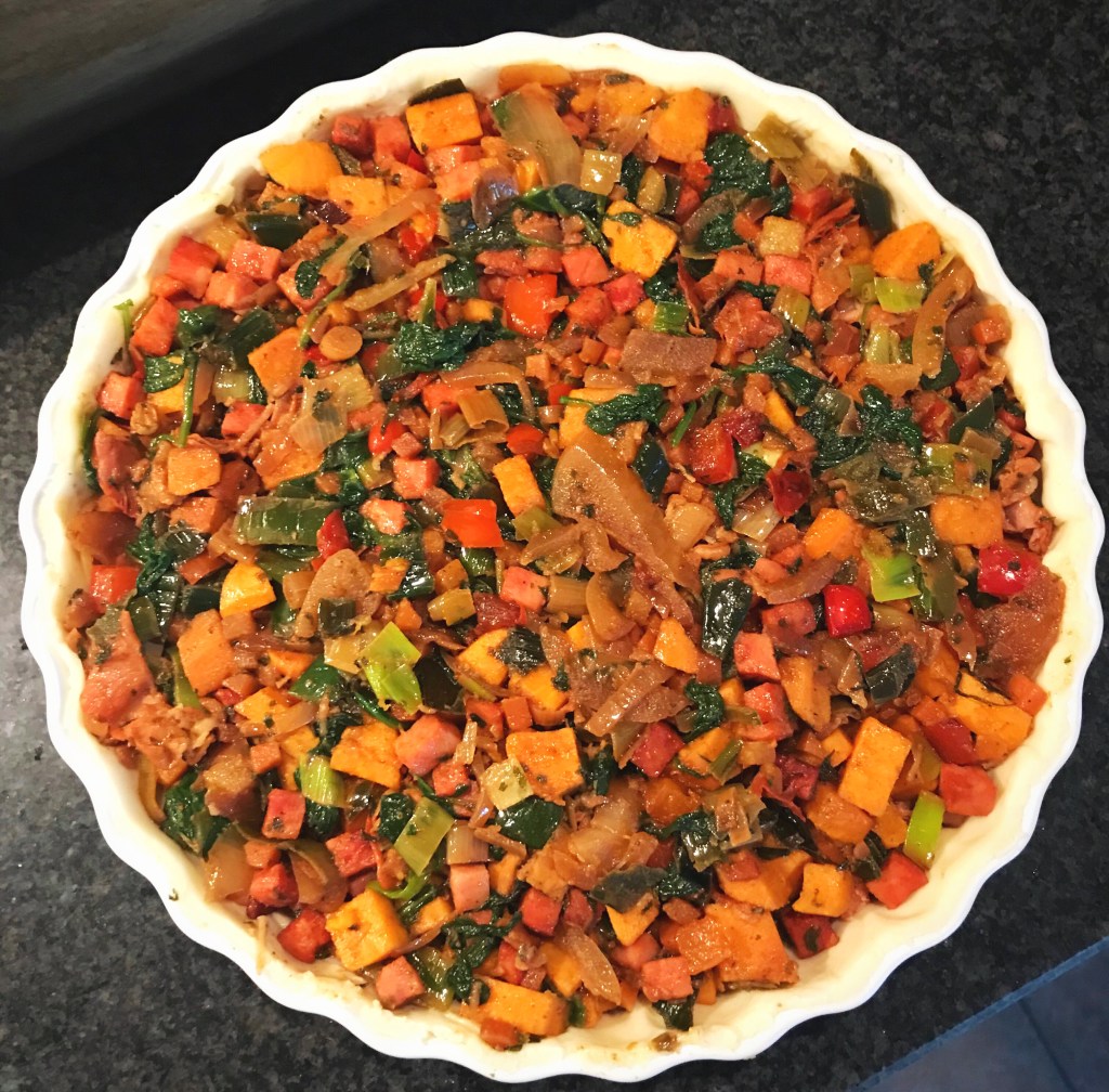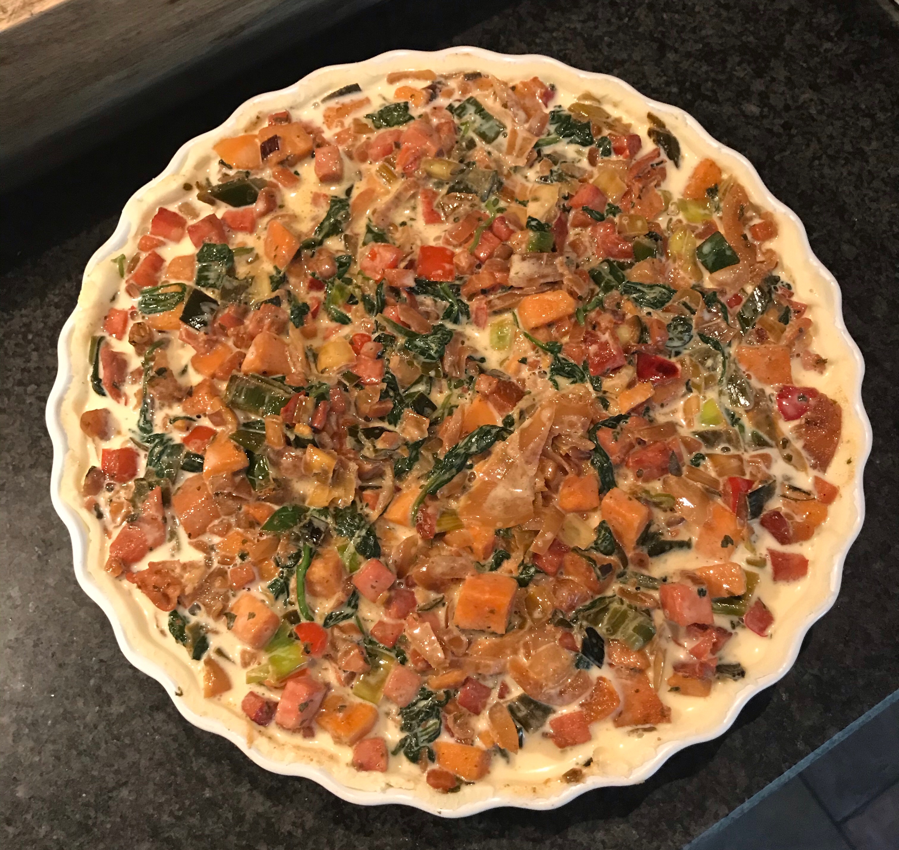 Schep het zoete aardappel / spinazie mengsel in de vorm en schenk het ei met de room erover.