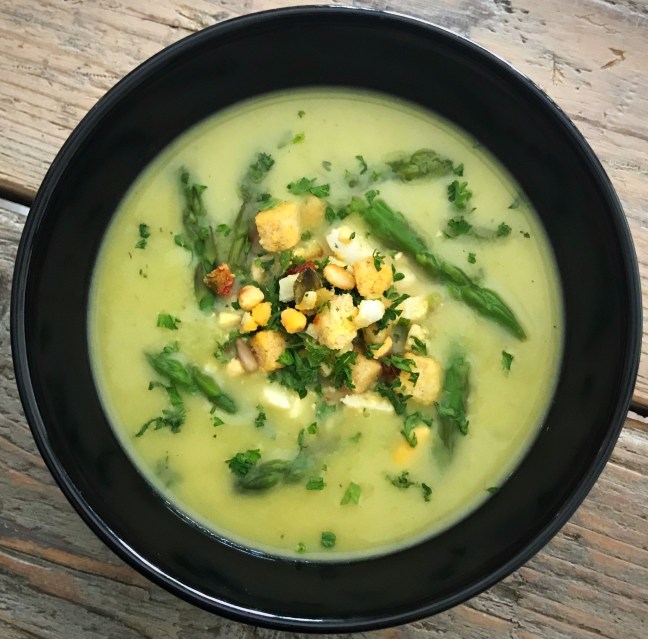 Roer net voor het serveren de kopjes van de asperge door de soep