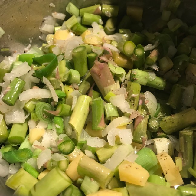 Voeg de aspergestukjes , ( niet de kopjes) de aardappel en de prei toe.