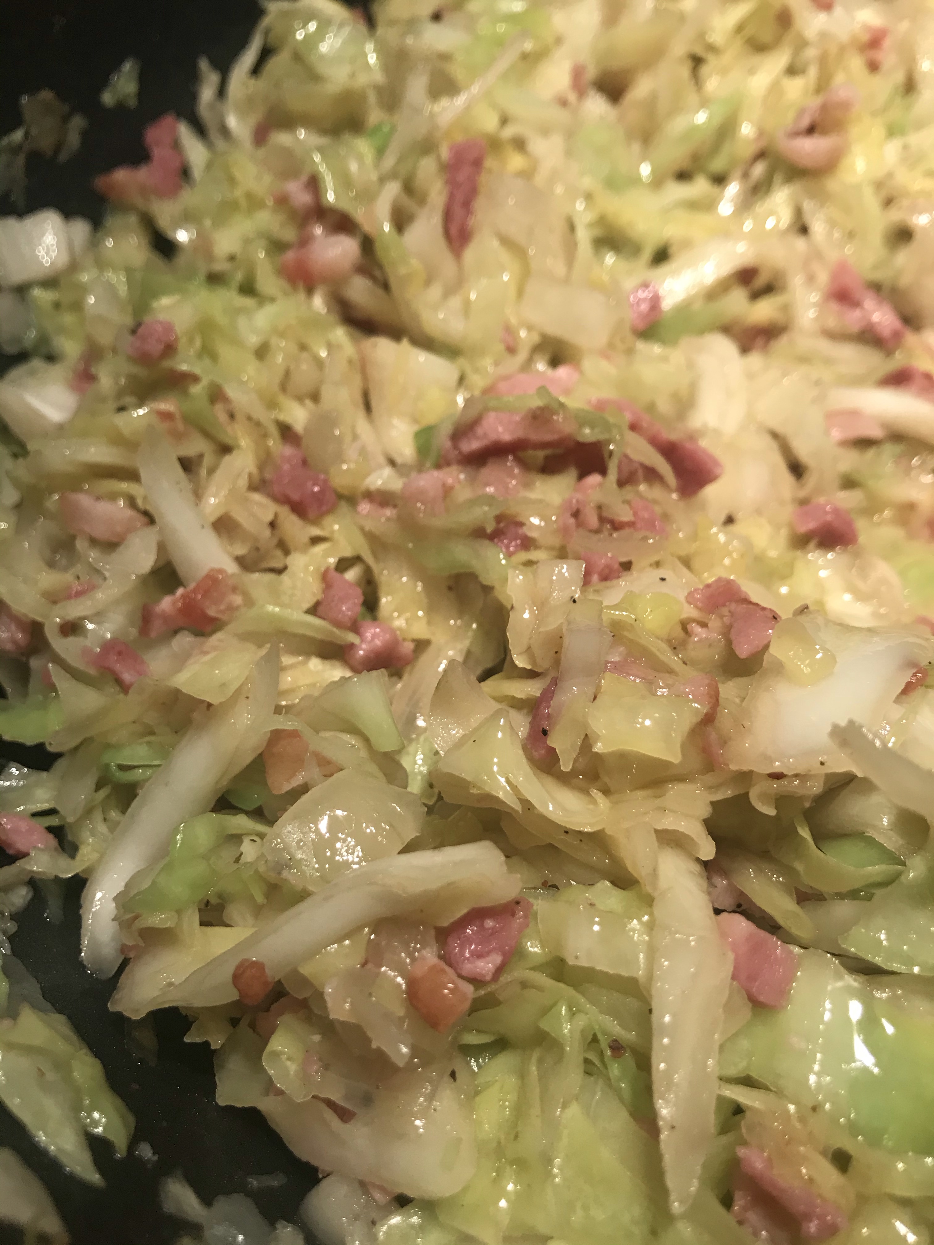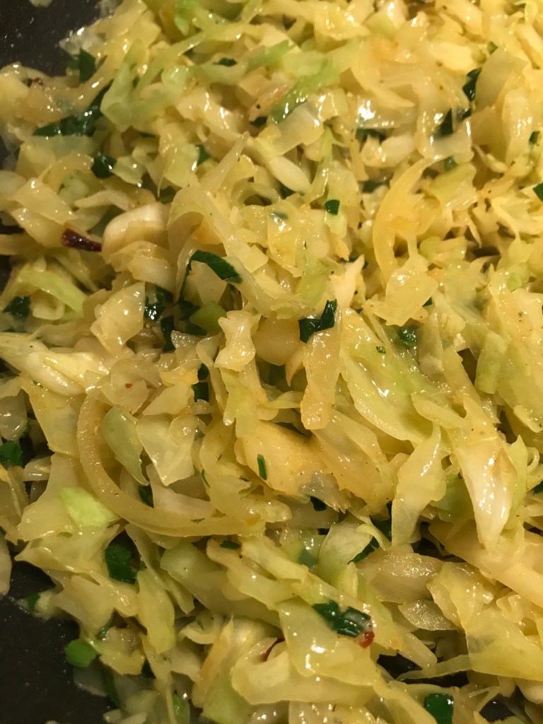 Voeg de knoflook , spitskool en curry masala kruiden toe.