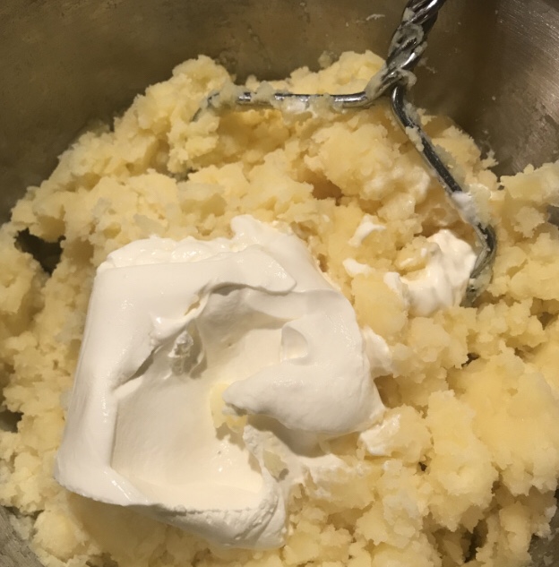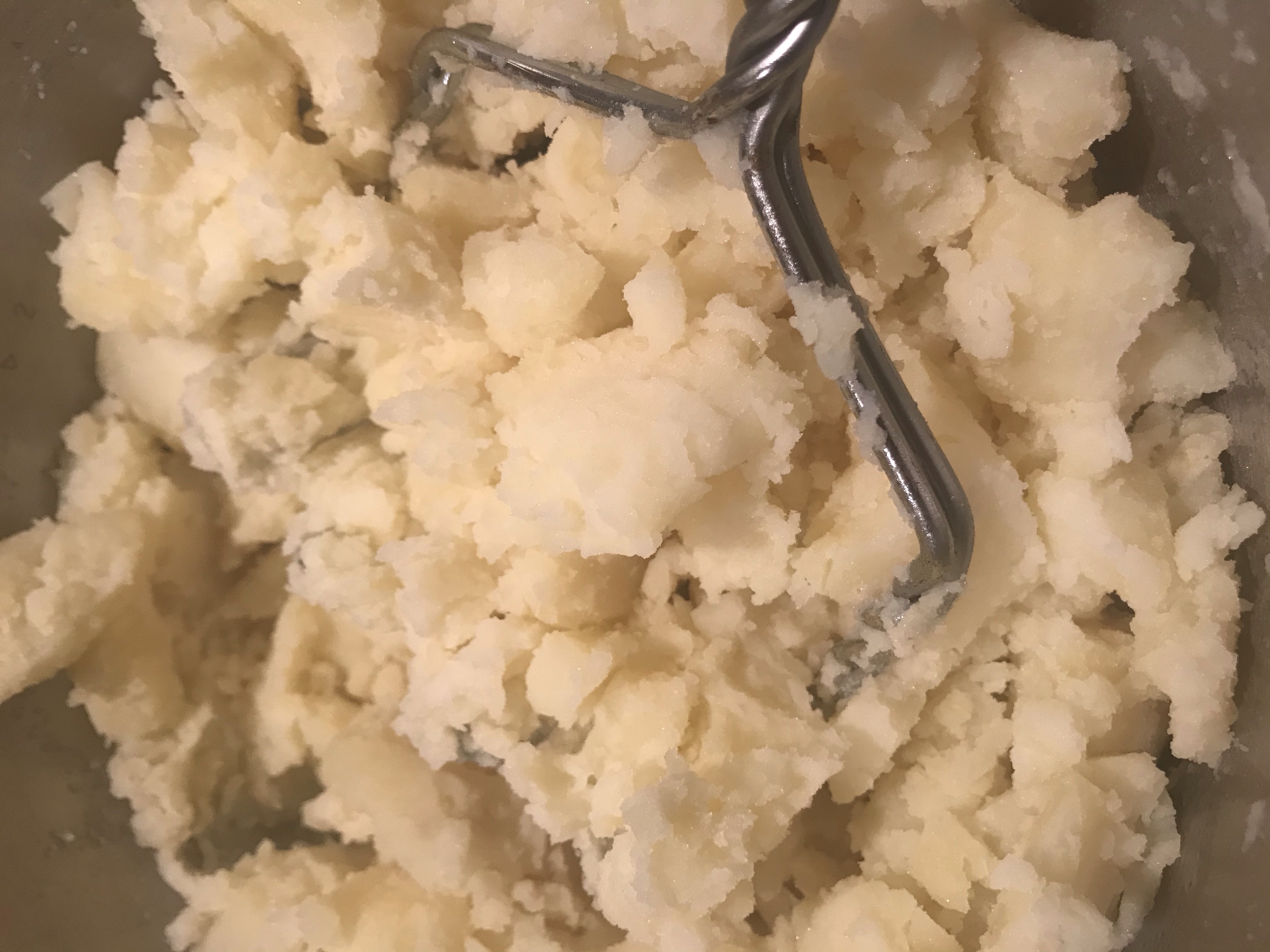 Giet de aardappelen af en stamp ze grof met een stamper.