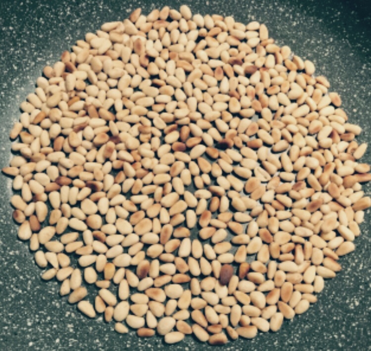 Rooster ondertussen de pijnboompitjes in een droge koekenpan, haal ze uit de pan en laat ze afkoelen.