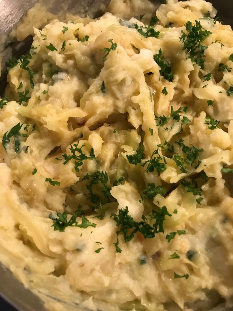 Garneer de stamppot als laatste met de pijnboompitjes en verse peterselie.