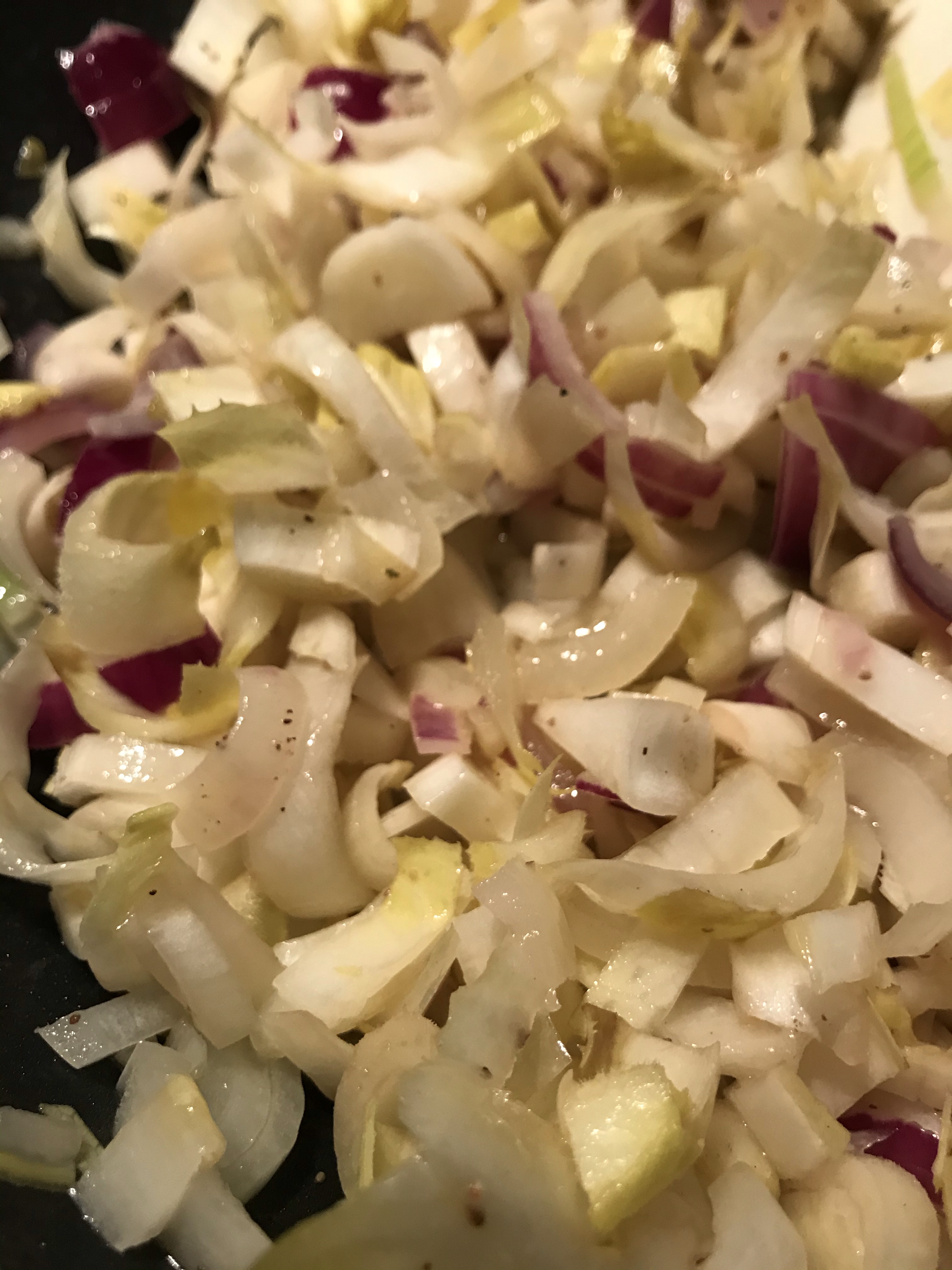Voeg nu de crème fraîche en de spitskool toe.