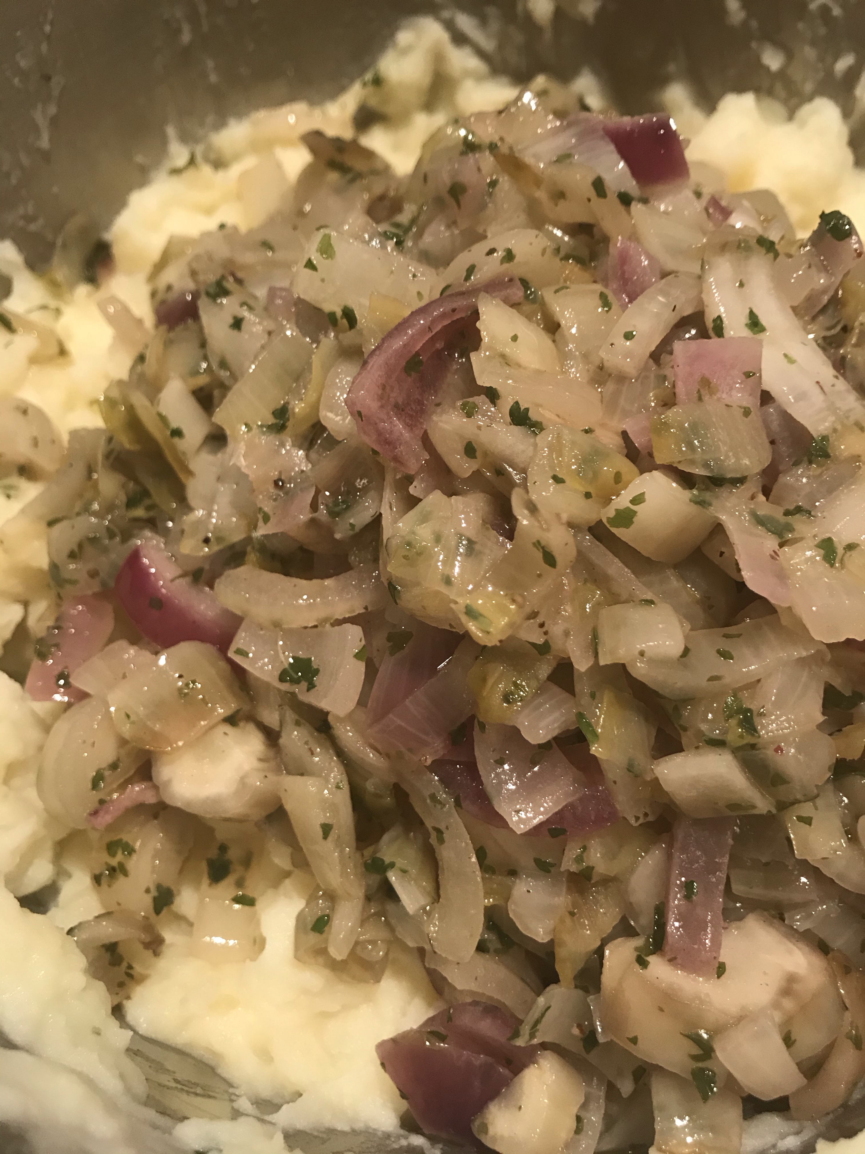 Garneer de stamppot als laatste met de pijnboompitjes en verse peterselie.