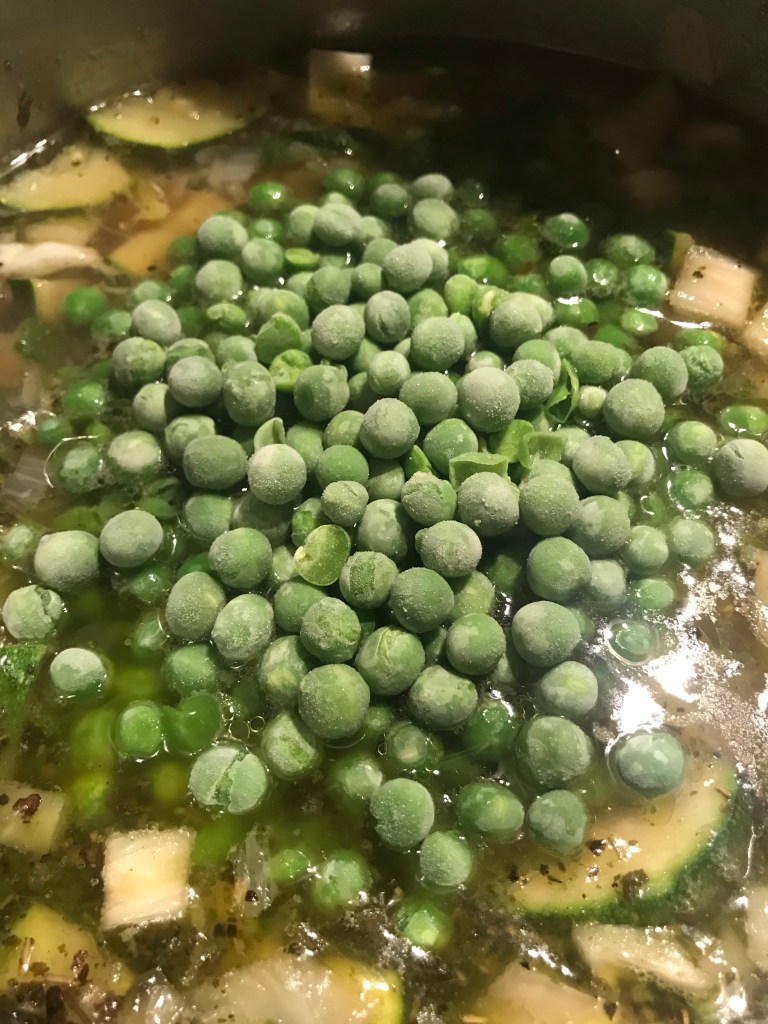 Laat 10 – 15 minuten op zacht vuur koken en voeg de laatste 3 min. de erwtjes toe.